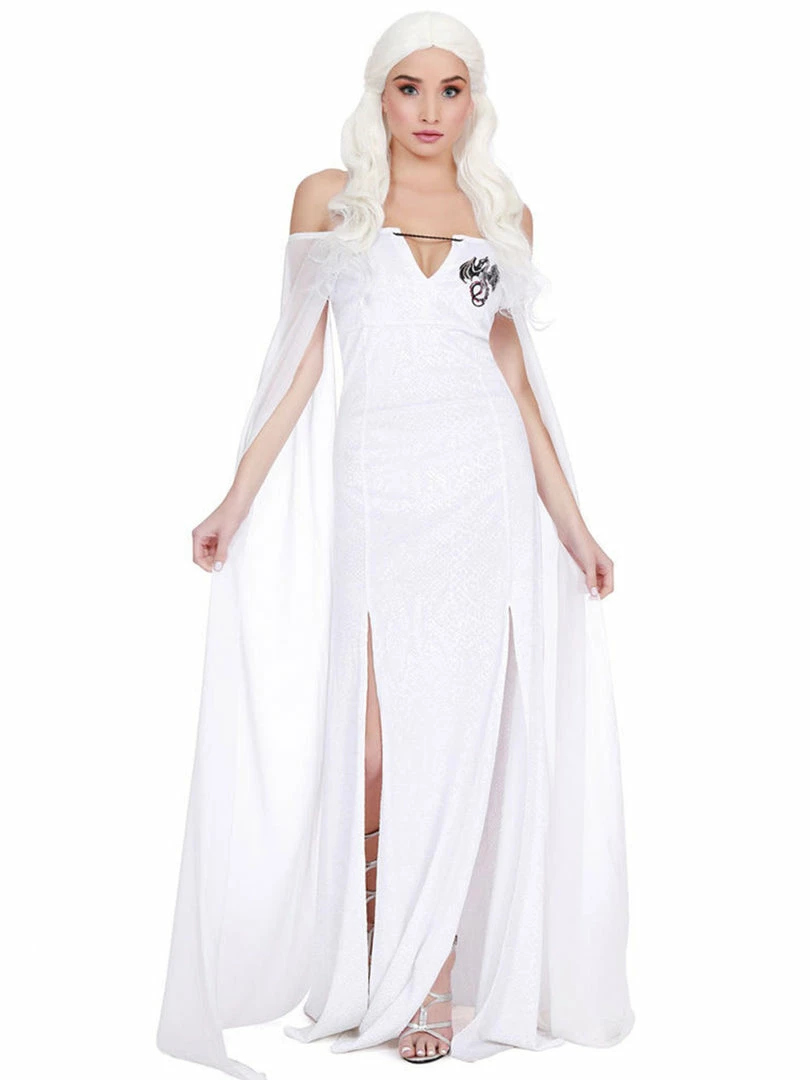 Channel your inner Daenerys Targaryen in this chic Game of Thrones Costume! This women’s costume features a beautiful white scale print embossed full-length velvet gown, dragon appliqué on the right breast, and a goddess-like off the shoulder neckline and flowing sheer chiffon sleeves.Â