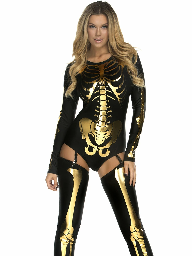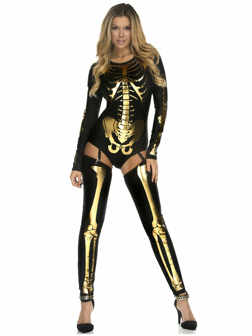The black bodysuit is completed with adjustable garter straps and matching black thigh high stockings with matching metallic gold skeleton bone accents.