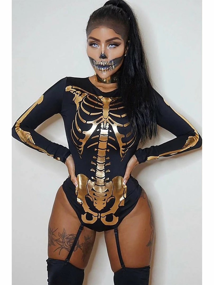 This bad to the bone Skin & Bones Skeleton Bodysuit Costume features a sexy long sleeve black bodysuit with a high scoop neckline and metallic gold Skelton bone print.Â