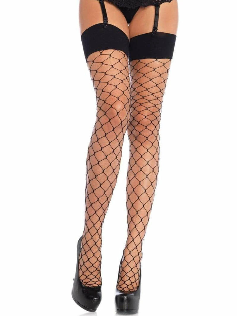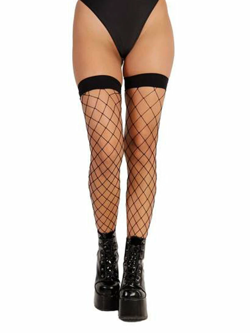 These sexy thigh high stockings featuring wide bands at the top to hug your thighs and large diamond fence net construction in stretchy black nylon.