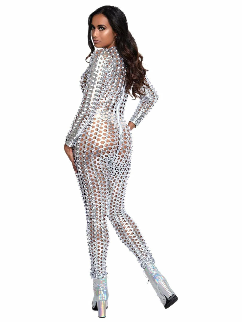 - Package includes:Silver Metallic long sleeve catsuit with laser-cut accents and Zipper back for easy wear.