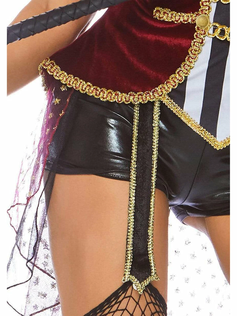 You’ll have em’ jumping through hoops when they see you in the ultra-sexy 3 piece Daring Lion Tamer Costume! Your sexy one-woman circus show starts with a gold-trimmed garter romper with a velvet waistcoat, black and white striped bodice, fringed shoulder epaulette, and teeny tint black booty shorts with a sheer tulle fishtail bustle inspired by burlesque costumes! This women’s costume is topped off with a red bow tie choker and velvet top hat to make sure you get a standing ovation.