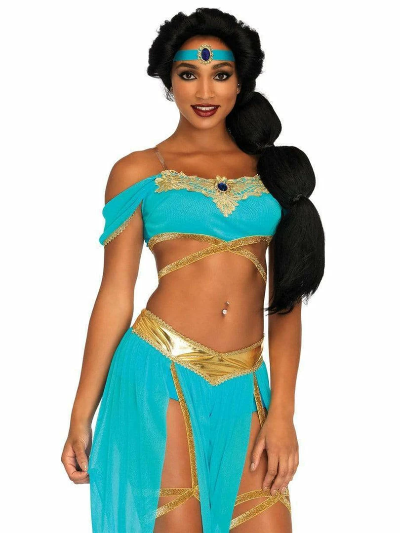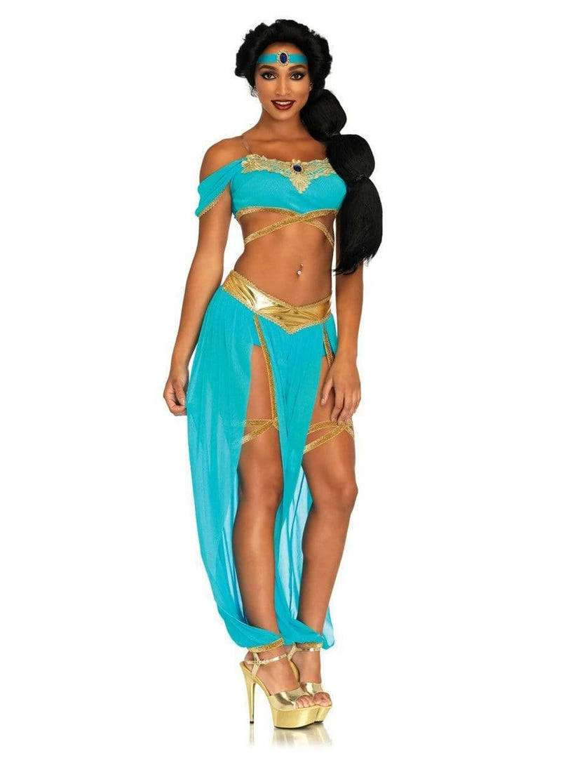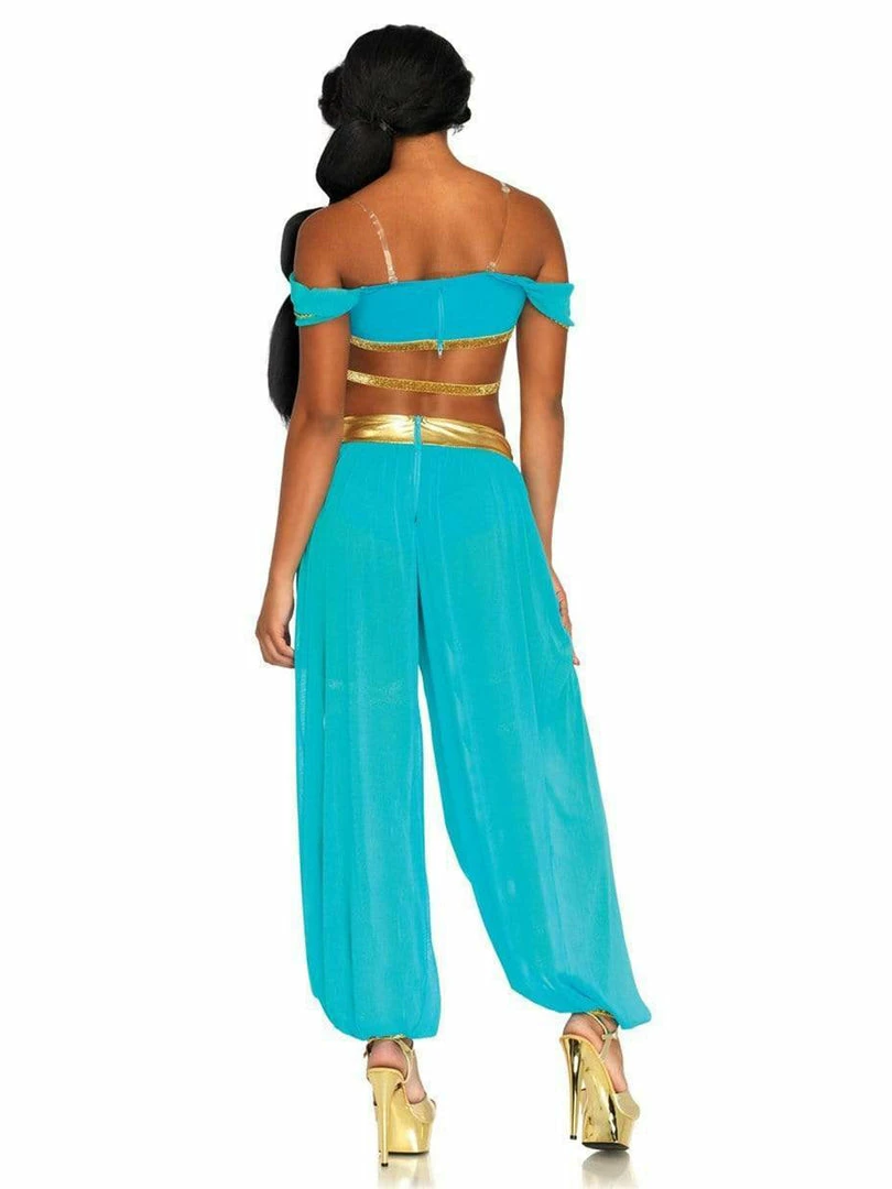 This womens costume will have you looking like a Disney book with dazzling blue and gold colours, providing serious Princess Jasmine vibes! Perfect for your next Arabian nights costume party, or movie themed dress up party, this Oasis Princess Costume Set got you on a magic carpet ride!
