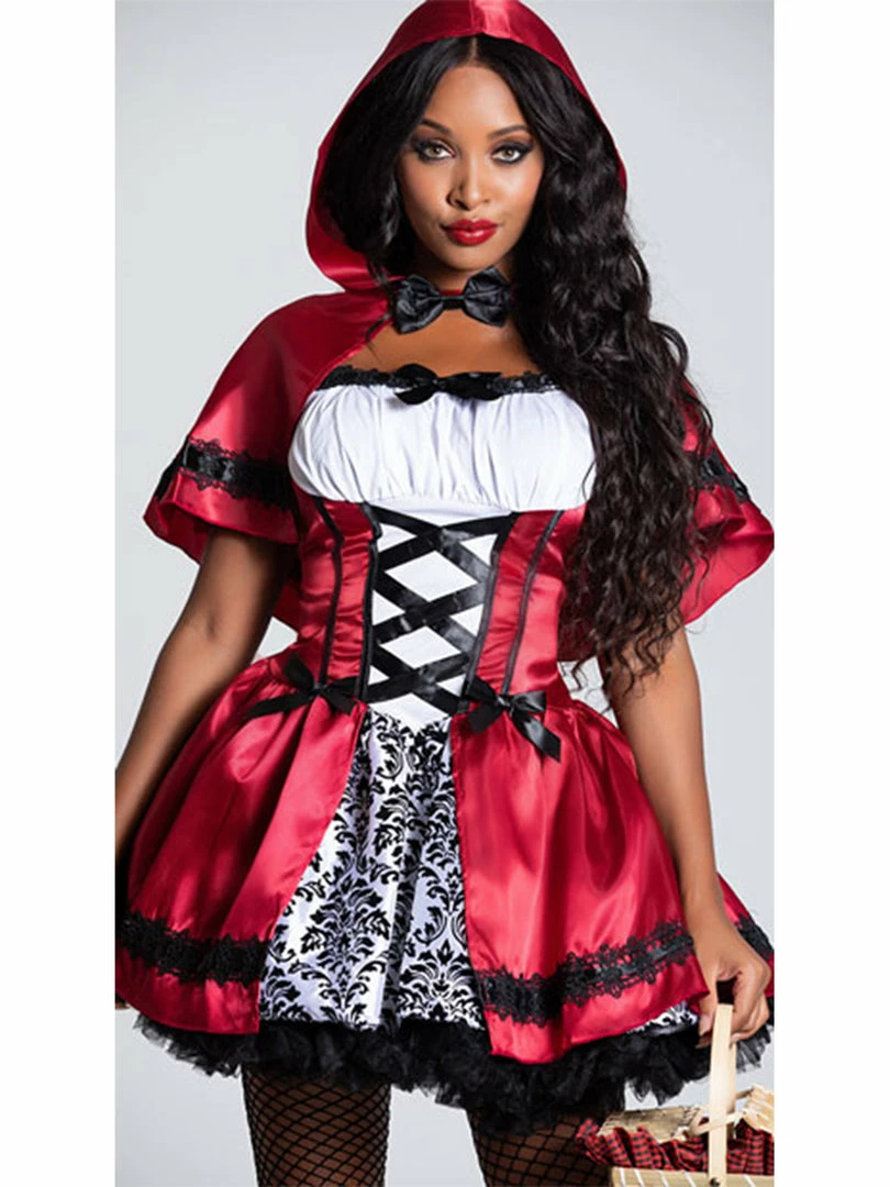 This sexy two-piece Red Riding Hood costume includes a satin and brocade print, peasant-style mini dress with faux lace-up corset bodice, black satin bows, Venetian lace trim and matching hooded cape. Pair this Womens Costume with flirty fishnets, bold boots, and (of course) a basket and show the big bad wolf who is boss!