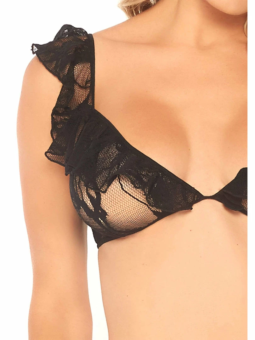 You’ll keep ‘em up all night when you put on this sultry lace ruffle bralette lingerie set by Leg Avenue!